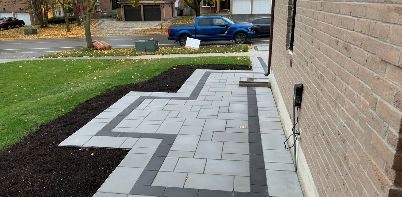 We installed an amazing driveway that boasts tightly interlocking stones in patterns of gray and black. The black stairs leading up to the door and other black accent colors around the house helped to really bring the design together.